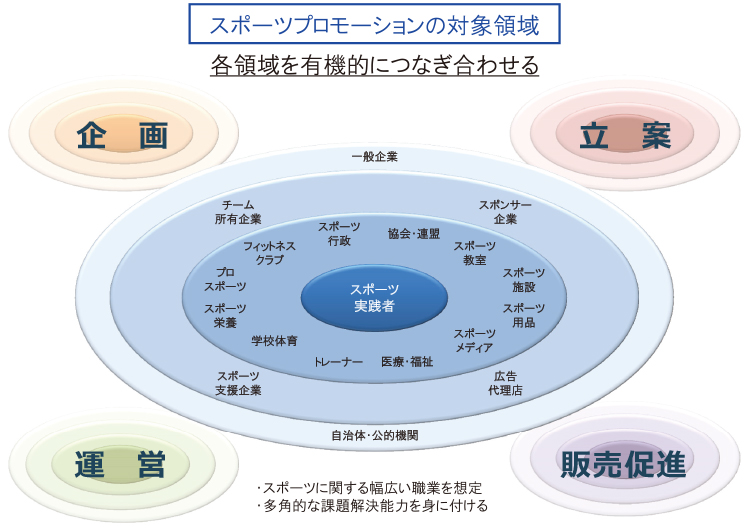 主として、競技スポーツのプロモーションについて、競技者能力を発揮・開発するためのコーディネーション能力を基盤にして、それを取り巻くより広い背景や状況、例えばスポーツ報道やスポーツイベントとの関わりから支援し活性化する能力を開発するコースです。