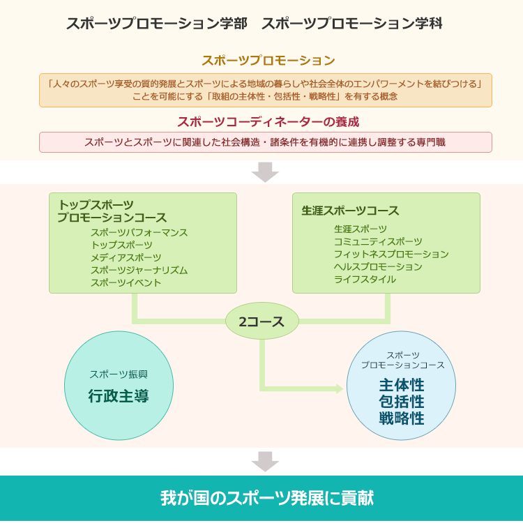 本学では、生活地域・社会をプロモートするスポーツのデザイン経営、政策立案能力開発を学ぶことによって、社会全体を見通す幅広い視点 とマネジメント能力を習得し、問題を発見して解決できる実践力を有する人材の養成を目的とした授業を行い、スポーツコーディネーターの育成を目指します。