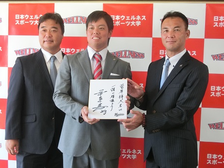 左から、柴岡三千夫理事長・学長、菅原祥太君、硬式野球部工藤洋一監督