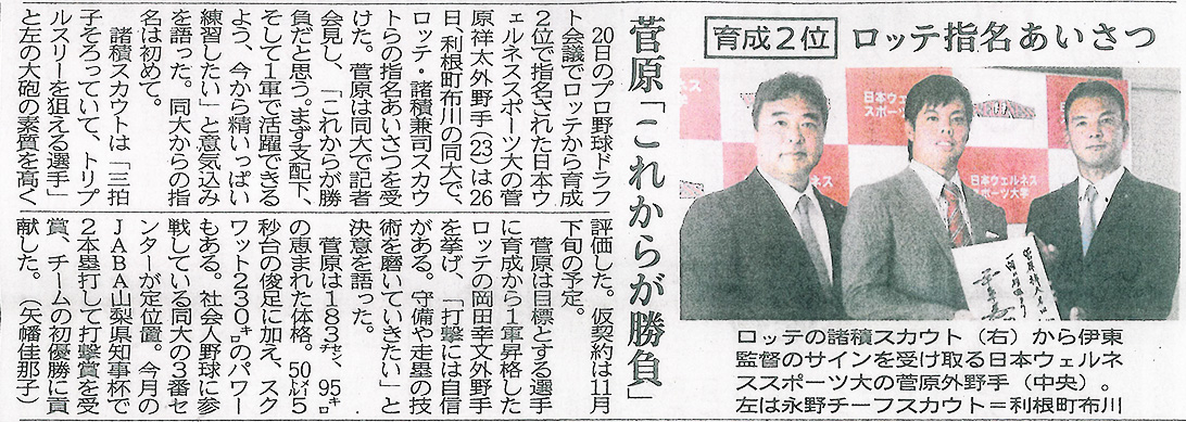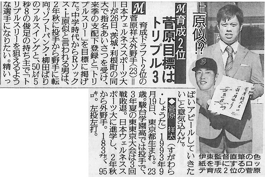 2016.10.28 菅原祥太(ドラフト育成2位)新聞記事紹介 1 平成28年10月20日に行われたドラフト会議にて、千葉ロッテマリーンズから育成ドラフト2位で指名された菅原祥太君の新聞記事を紹介致します。スポーツニッポンスポーツ報知茨城新聞 ◀ 前の記事 | 2016年度の記事一覧 | 次の記事 ▶ 新着情報 ニュース&トピックス一覧クラブ活動新着記事一覧全ての新着情報一覧